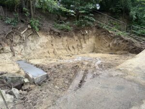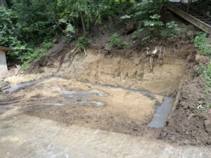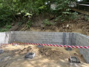 Bylo nutné odbagrovat velkou část meze vedel schodů vedoucích k původním toaletám, postavit ochrannou zeď a také nachystat patky pro usazení nových toalet.